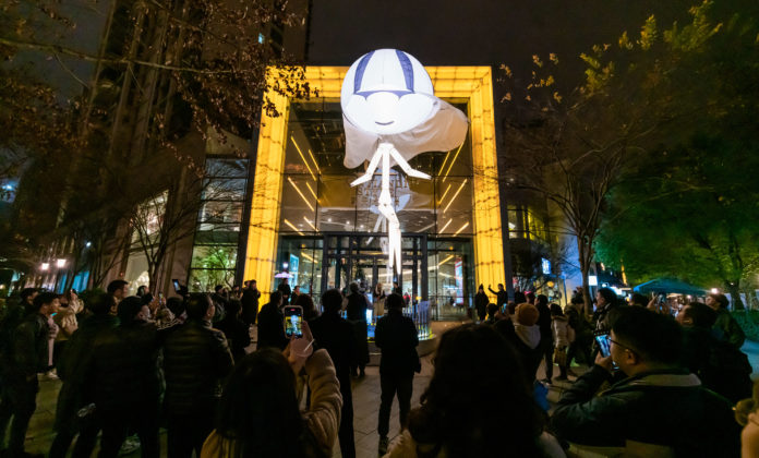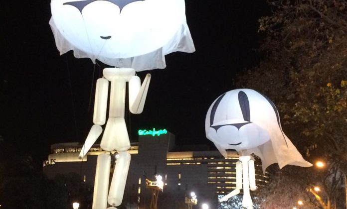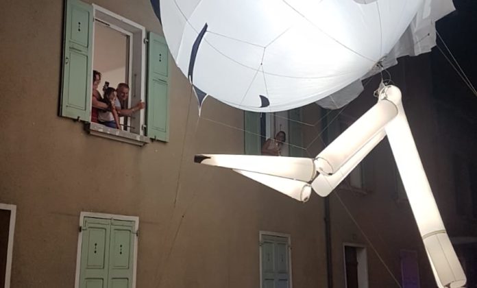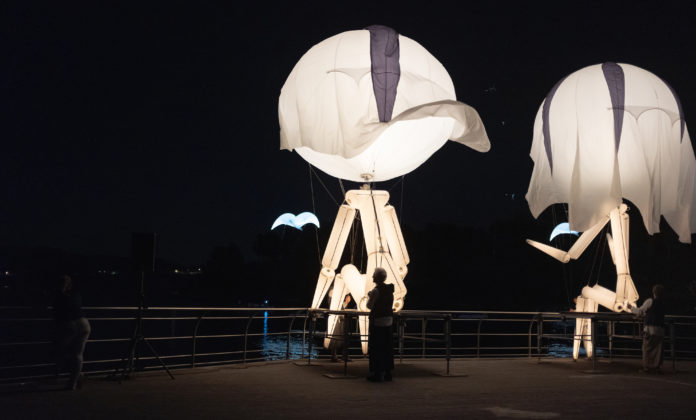 Balade interactive nocturne ou diurne pour une marionnette gracile, gonflable et lumineuse, animée par 2 marionnettistes.