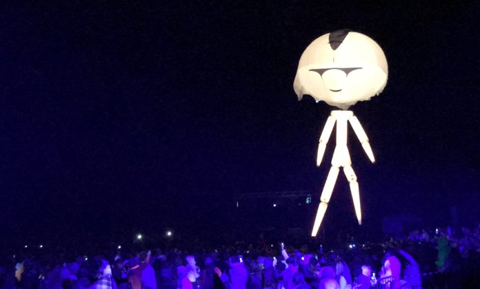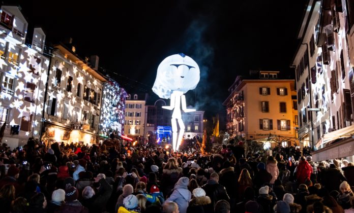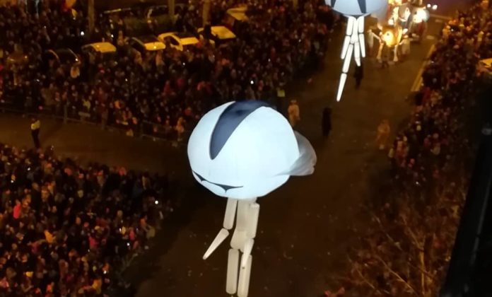 CELESTE, marionnette géante et lumineuse de 9 mètres, se glisse au-dessus de nos têtes, danse les courants d’airs, illumine nos visages.