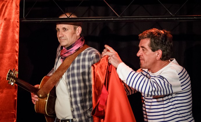 Représentation tout terrain pour deux clowns, une guitare et un rideau rouge, en rue ou en salle, sur scène ou au sol…
